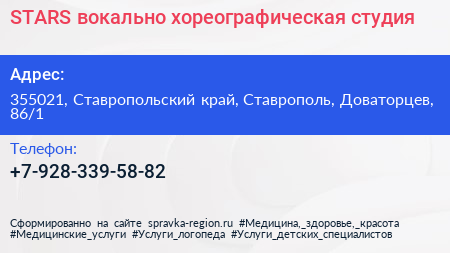 STARS, вокально-хореографическая студия по адресу 355021, Ставропольский край, Ставрополь, Доваторцев, 86/1 в дальнейшем Организация, размещена в следующих категориях: