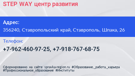 STEP & WAY, центр развития по адресу 356240, Ставропольский край, Ставрополь, Шпака, 26 в дальнейшем Организация, размещена в следующих категориях: