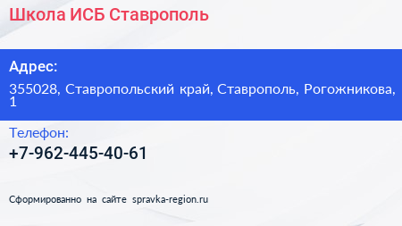 Школа ИСБ Ставрополь по адресу 355028, Ставропольский край, Ставрополь, Рогожникова, 1 в дальнейшем Организация, размещена в следующих категориях: