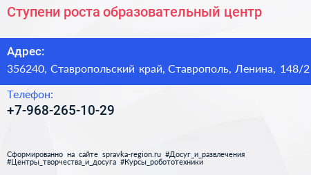 Ступени роста, образовательный центр по адресу 356240, Ставропольский край, Ставрополь, Ленина, 148/2 в дальнейшем Организация, размещена в следующих категориях: