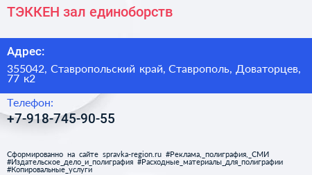ТЭККЕН, зал единоборств по адресу 355042, Ставропольский край, Ставрополь, Доваторцев, 77 к2 в дальнейшем Организация, размещена в следующих категориях: