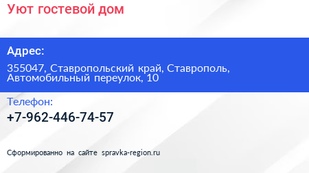 Уют, гостевой дом по адресу 355047, Ставропольский край, Ставрополь, Автомобильный переулок, 10 в дальнейшем Организация, размещена в следующих категориях: