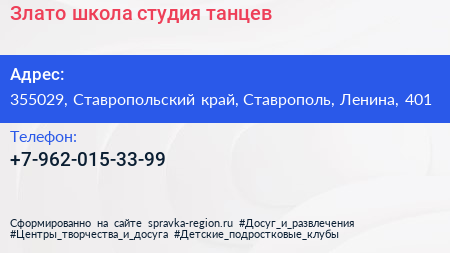 Злато, школа-студия танцев по адресу 355029, Ставропольский край, Ставрополь, Ленина, 401 в дальнейшем Организация, размещена в следующих категориях: