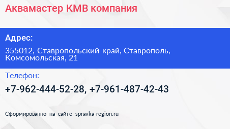 Аквамастер-КМВ, компания по адресу 355012, Ставропольский край, Ставрополь, Комсомольская, 21 в дальнейшем Организация, размещена в следующих категориях: