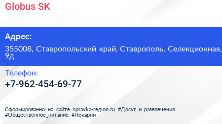 Globus SK по адресу 355008, Ставропольский край, Ставрополь, Селекционная, 9д в дальнейшем Организация, размещена в следующих категориях: