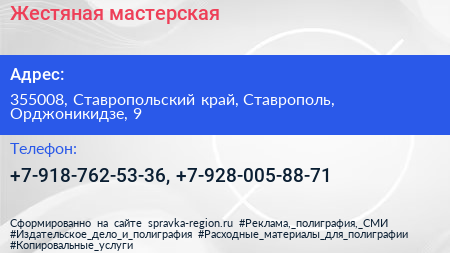 Жестяная мастерская по адресу 355008, Ставропольский край, Ставрополь, Орджоникидзе, 9 в дальнейшем Организация, размещена в следующих категориях: