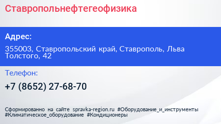 Ставропольнефтегеофизика по адресу 355003, Ставропольский край, Ставрополь, Льва Толстого, 42 в дальнейшем Организация, размещена в следующих категориях: