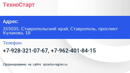 ТехноСтарт по адресу 355035, Ставропольский край, Ставрополь, проспект Кулакова, 18 в дальнейшем Организация, размещена в следующих категориях: