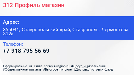 312 Профиль, магазин по адресу 355041, Ставропольский край, Ставрополь, Лермонтова, 312а в дальнейшем Организация, размещена в следующих категориях: