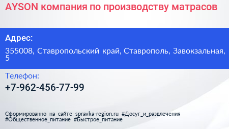 AYSON, компания по производству матрасов по адресу 355008, Ставропольский край, Ставрополь, Завокзальная, 5 в дальнейшем Организация, размещена в следующих категориях: