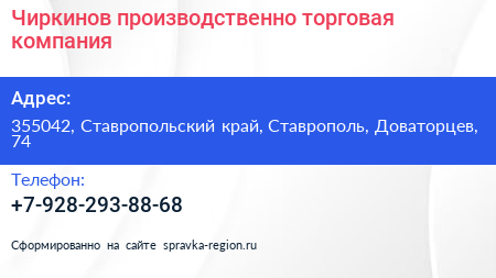 Чиркинов, производственно-торговая компания по адресу 355042, Ставропольский край, Ставрополь, Доваторцев, 74 в дальнейшем Организация, размещена в следующих категориях: