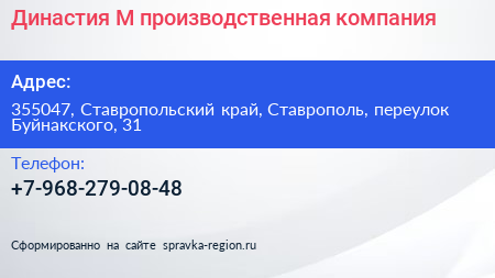 Династия-М, производственная компания по адресу 355047, Ставропольский край, Ставрополь, переулок Буйнакского, 31 в дальнейшем Организация, размещена в следующих категориях: