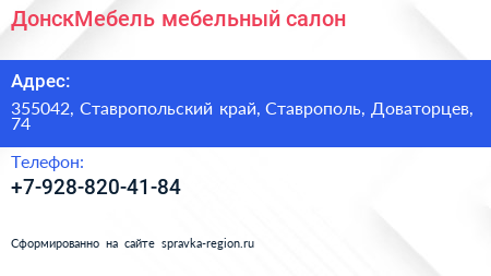 ДонскМебель, мебельный салон по адресу 355042, Ставропольский край, Ставрополь, Доваторцев, 74 в дальнейшем Организация, размещена в следующих категориях: