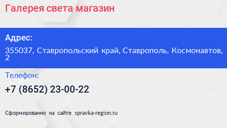 Галерея света, магазин по адресу 355037, Ставропольский край, Ставрополь, Космонавтов, 2 в дальнейшем Организация, размещена в следующих категориях: