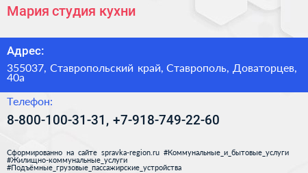 Мария, студия кухни по адресу 355037, Ставропольский край, Ставрополь, Доваторцев, 40а в дальнейшем Организация, размещена в следующих категориях: