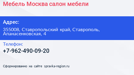 Мебель-Москва, салон мебели по адресу 355008, Ставропольский край, Ставрополь, Апанасенковская, 4 в дальнейшем Организация, размещена в следующих категориях: