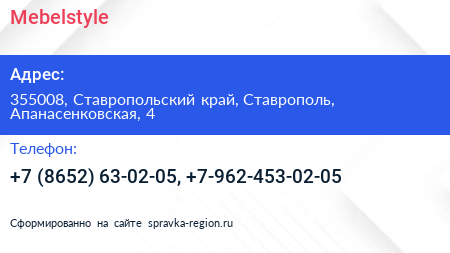 Mebelstyle по адресу 355008, Ставропольский край, Ставрополь, Апанасенковская, 4 в дальнейшем Организация, размещена в следующих категориях: