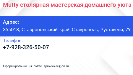 Mutty, столярная мастерская домашнего уюта по адресу 355018, Ставропольский край, Ставрополь, Руставели, 79 в дальнейшем Организация, размещена в следующих категориях: