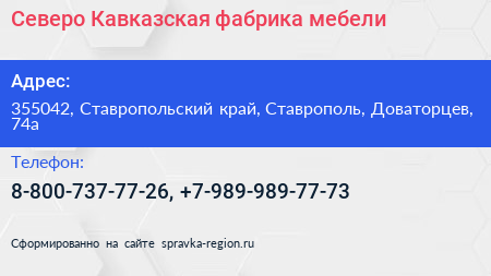 Северо-Кавказская фабрика мебели по адресу 355042, Ставропольский край, Ставрополь, Доваторцев, 74а в дальнейшем Организация, размещена в следующих категориях: