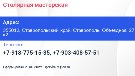 Столярная мастерская по адресу 355012, Ставропольский край, Ставрополь, Объездная, 27 к2 в дальнейшем Организация, размещена в следующих категориях: