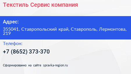 Текстиль-Сервис, компания по адресу 355041, Ставропольский край, Ставрополь, Лермонтова, 219 в дальнейшем Организация, размещена в следующих категориях:
