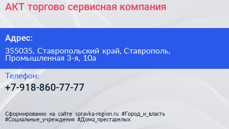 АКТ, торгово-сервисная компания по адресу 355035, Ставропольский край, Ставрополь, Промышленная 3-я, 10а в дальнейшем Организация, размещена в следующих категориях: