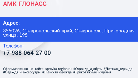АМК ГЛОНАСС по адресу 355026, Ставропольский край, Ставрополь, Пригородная улица, 195 в дальнейшем Организация, размещена в следующих категориях: