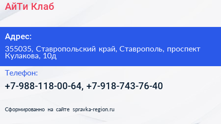АйТи Клаб по адресу 355035, Ставропольский край, Ставрополь, проспект Кулакова, 10д в дальнейшем Организация, размещена в следующих категориях: