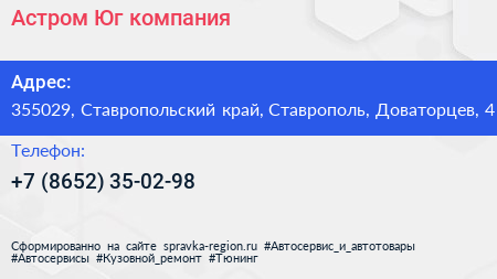 Астром-Юг, компания по адресу 355029, Ставропольский край, Ставрополь, Доваторцев, 4 в дальнейшем Организация, размещена в следующих категориях: