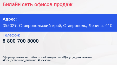 Билайн, сеть офисов продаж по адресу 355029, Ставропольский край, Ставрополь, Ленина, 410 в дальнейшем Организация, размещена в следующих категориях:
