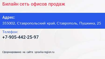 Билайн, сеть офисов продаж по адресу 355002, Ставропольский край, Ставрополь, Пушкина, 25 в дальнейшем Организация, размещена в следующих категориях: