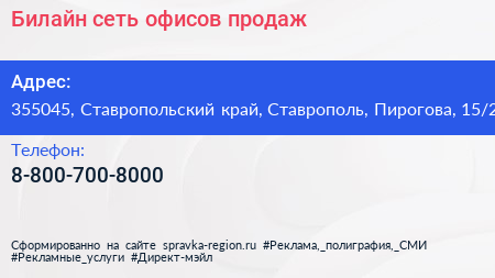 Билайн, сеть офисов продаж по адресу 355045, Ставропольский край, Ставрополь, Пирогова, 15/2 в дальнейшем Организация, размещена в следующих категориях: