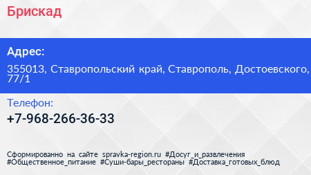 Брискад по адресу 355013, Ставропольский край, Ставрополь, Достоевского, 77/1 в дальнейшем Организация, размещена в следующих категориях: