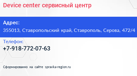 Device center, сервисный центр по адресу 355013, Ставропольский край, Ставрополь, Серова, 472/4 в дальнейшем Организация, размещена в следующих категориях:
