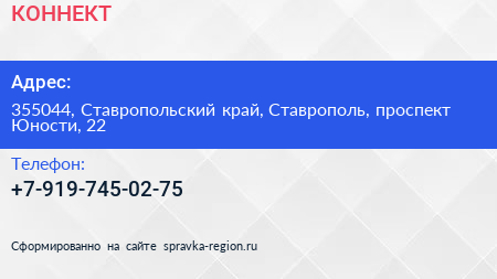 КОННЕКТ по адресу 355044, Ставропольский край, Ставрополь, проспект Юности, 22 в дальнейшем Организация, размещена в следующих категориях: