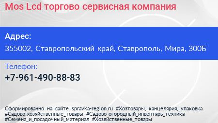 Mos-Lcd, торгово-сервисная компания по адресу 355002, Ставропольский край, Ставрополь, Мира, 300Б в дальнейшем Организация, размещена в следующих категориях:
