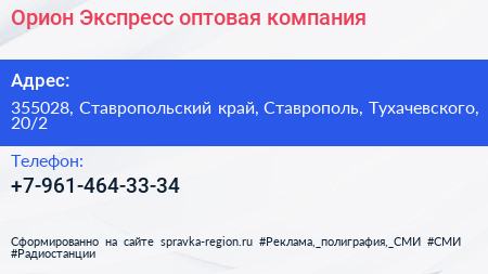 Орион Экспресс, оптовая компания по адресу 355028, Ставропольский край, Ставрополь, Тухачевского, 20/2 в дальнейшем Организация, размещена в следующих категориях: