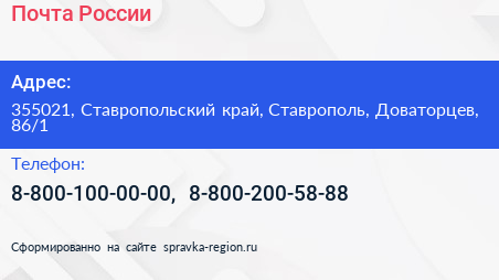 Почта России по адресу 355021, Ставропольский край, Ставрополь, Доваторцев, 86/1 в дальнейшем Организация, размещена в следующих категориях:
