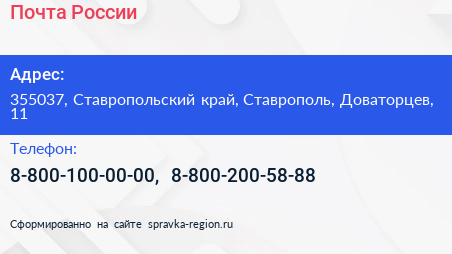 Почта России по адресу 355037, Ставропольский край, Ставрополь, Доваторцев, 11 в дальнейшем Организация, размещена в следующих категориях: