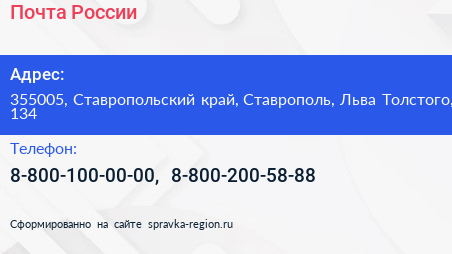 Почта России по адресу 355005, Ставропольский край, Ставрополь, Льва Толстого, 134 в дальнейшем Организация, размещена в следующих категориях: