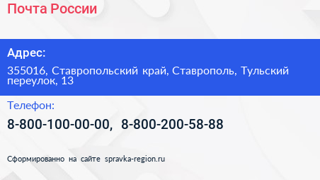 Почта России по адресу 355016, Ставропольский край, Ставрополь, Тульский переулок, 13 в дальнейшем Организация, размещена в следующих категориях: