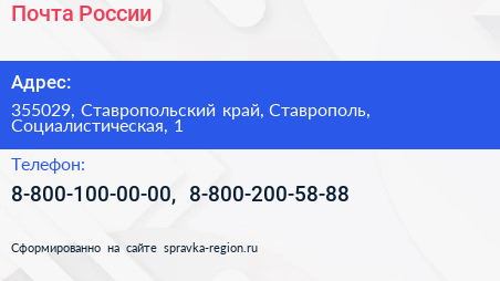 Почта России по адресу 355029, Ставропольский край, Ставрополь, Социалистическая, 1 в дальнейшем Организация, размещена в следующих категориях: