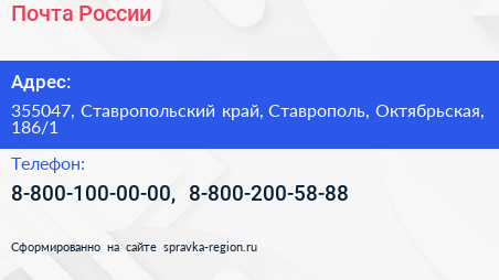 Почта России по адресу 355047, Ставропольский край, Ставрополь, Октябрьская, 186/1 в дальнейшем Организация, размещена в следующих категориях: