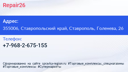 Repair26 по адресу 355006, Ставропольский край, Ставрополь, Голенева, 26 в дальнейшем Организация, размещена в следующих категориях: