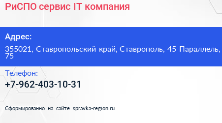 РиСПО-сервис, IT-компания по адресу 355021, Ставропольский край, Ставрополь, 45 Параллель, 75 в дальнейшем Организация, размещена в следующих категориях: