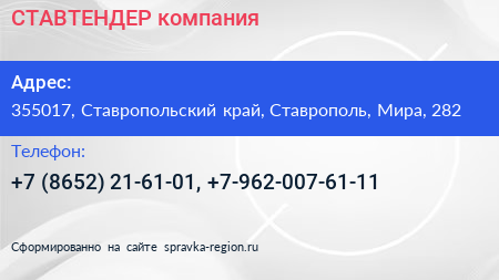 СТАВТЕНДЕР, компания по адресу 355017, Ставропольский край, Ставрополь, Мира, 282 в дальнейшем Организация, размещена в следующих категориях: