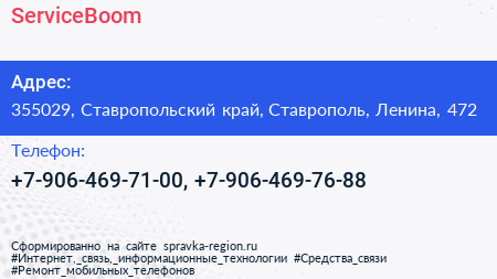 ServiceBoom по адресу 355029, Ставропольский край, Ставрополь, Ленина, 472 в дальнейшем Организация, размещена в следующих категориях:
