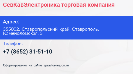 СевКавЭлектроника, торговая компания по адресу 355002, Ставропольский край, Ставрополь, Каменоломская, 3 в дальнейшем Организация, размещена в следующих категориях: