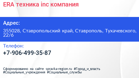 ERA техника inc., компания по адресу 355028, Ставропольский край, Ставрополь, Тухачевского, 22/6 в дальнейшем Организация, размещена в следующих категориях:
