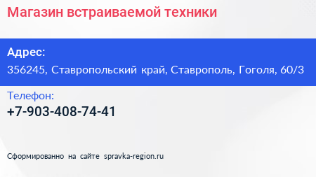 Магазин встраиваемой техники по адресу 356245, Ставропольский край, Ставрополь, Гоголя, 60/3 в дальнейшем Организация, размещена в следующих категориях: